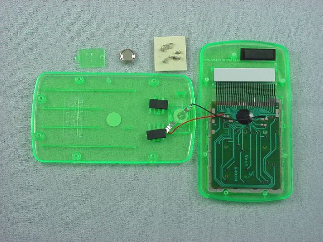 Case back (left), case front and electronics (right). The interior looked generally good. The PCB, which is the back of the keyboard, was heat staked (one pin), but, the PCB is well supported by the back case of the calculator. There was slight rust on the cell (no evidence of leakage). |