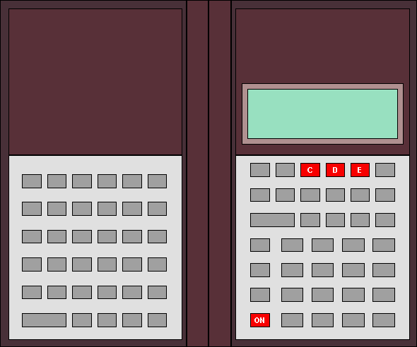 The HP-18C built in internal, display, and keyboard test functions. A continuous internal/display test is performed by simultaneously pressing the ON key and the fifth key on the top row (labeled "E" in the illustration below). Various internal and display tests will be performed until interrupted by simultaneously pressing the third key on the top row (labeled "C" in the illustration below) and the ON key. After the test is exited, "MACHINE RESET" will be displayed. The more thorough internal/display/keyboard test is performed by pressing the ON key and the fourth key on the top row (labeled "D" in the illustration below). Press any key to step through the various display and internal tests until "KEYBOARD TEST" is displayed. Starting with the left keyboard, in order press each key from left to right on each row, from the top row to the bottom row. Then proceed to press each key on the right keyboard in order from left to right and top to bottom. If the test is successful, "OK-18C-E" will be displayed. If a key is pressed out of order or there is a keyboard problem, and error message will be displayed. This test can be interupted at any time as described above. These same tests can probably be performed on HP's other clamshell business calculators, but that has not been verified by this author. |