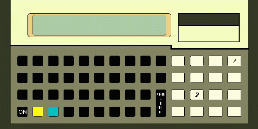 A quick test can be performed by simultaneously pressing ON and the sixth key (labeled "F" in the illustration to the right) on the top row. This test cycles through the ERAM, CPU, RAM, display, Kbd2, RS232 and IR tests. This test can be exited by pressing ON and the third key (labeled "C" in the illustration to the right) on the top row simultaneously. |