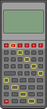 A quick test can be performed by simultaneously pressing ON and the sixth key (labeled "F" in the illustration to the right) on the top row. This test cycles through the ERAM, CPU, RAM, display, Kbd2, RS232 and IR tests. This test can be exited by pressing ON and the third key (labeled "C" in the illustration to the right) on the top row simultaneously. |