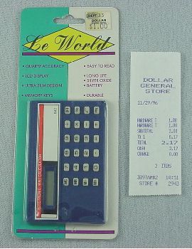 The receipt shows the purchase of two one-dollar calculators, one of which is pictured at the left, on November 29, 1996. With sales tax, the total cost for two calculators was $2.17. |