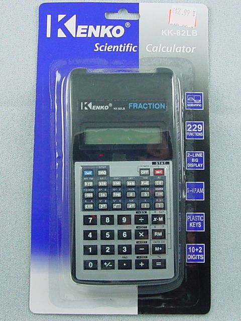 Kenko KK-82LB in its packaging. On the nameplate above the display, it plainly says "FRACTION." This calculator does not do fraction calculations as the term is commonly used to describe the functionality of a calculator. The packaging makes several claims that really aren't true - it looks like someone was confusing this 56-function calculator with a clone of a more modern Casio scientific calculator:
